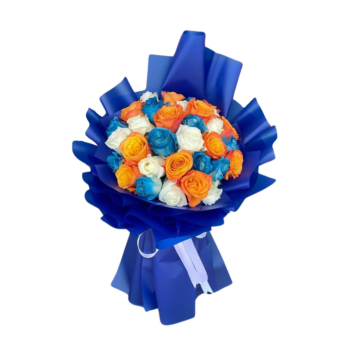 A burst of color and elegance, this bouquet blends 32 roses in blue, white, and orange tones, wrapped in a stylish blue wrap. It’s a harmonious arrangement that speaks of calmness, joy, and passion — all in one thoughtful gift.