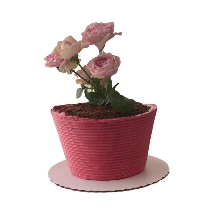 Sweetness meets elegance in this one-of-a-kind mini cake! Styled like a garden pot and topped with real, fresh pink roses, this cake brings a soft, romantic touch to your gift. Wrapped in a delicate pink creme and finished with edible soil-like chocolate crumbs and dainty pearl details, it's as charming as it is delicious.