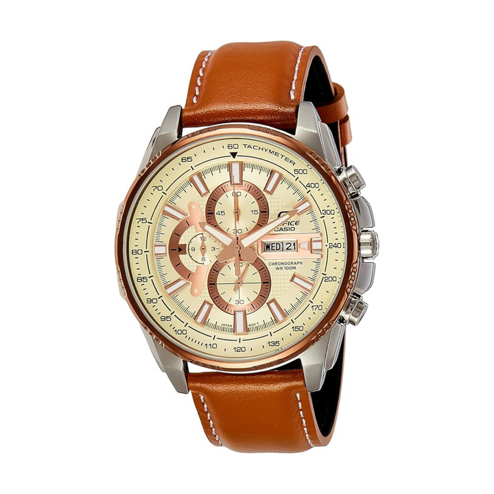 A timeless blend of elegance and functionality — the Casio Edifice EFR-549L-7AV features a sophisticated rose gold-tone bezel and a cream dial with three subdials, offering a stylish chronograph experience. The genuine brown leather strap adds a touch of classic charm, making it suitable for both casual and formal occasions.