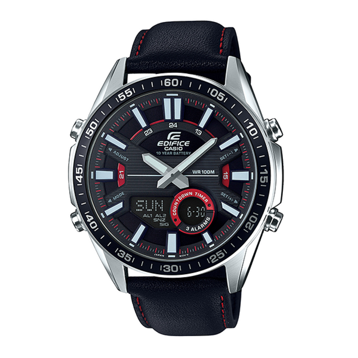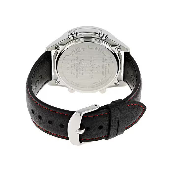 A versatile timepiece designed for the global citizen — the Casio Edifice EFV-C100L-1AV features both analog and digital displays, offering world time, Telememo memory (for storing up to 30 contacts), and an alarm. It’s built with a stainless steel/aluminum case, a genuine black leather band, and mineral glass for durability. With 100-meter water resistance, it’s ideal for everyday wear.