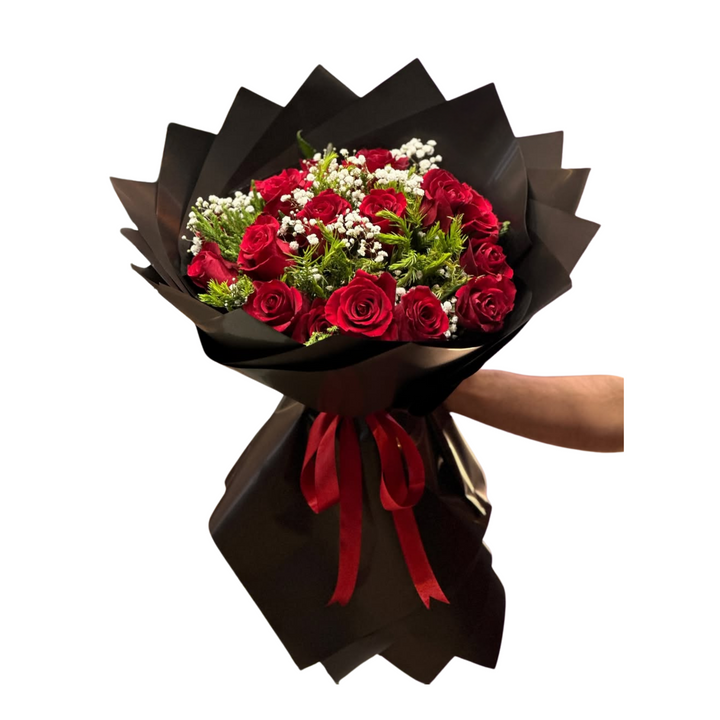 A bouquet that whispers deep devotion — 20 red roses wrapped in an elegant black wrap, adorned with a vivid red ribbon. This dramatic arrangement balances mystery and passion, ready to melt hearts in Anbar’s Ramadi, Falluja, and beyond.