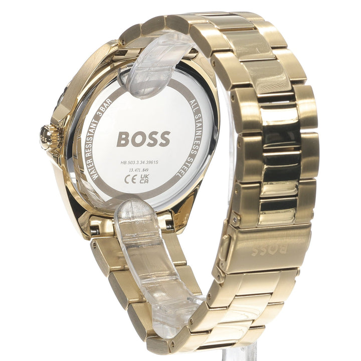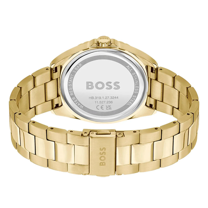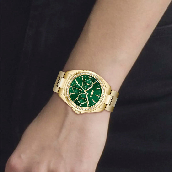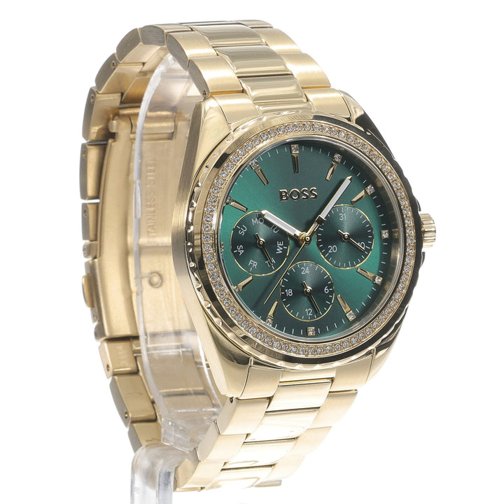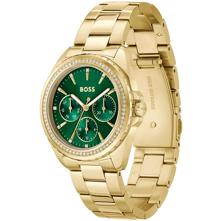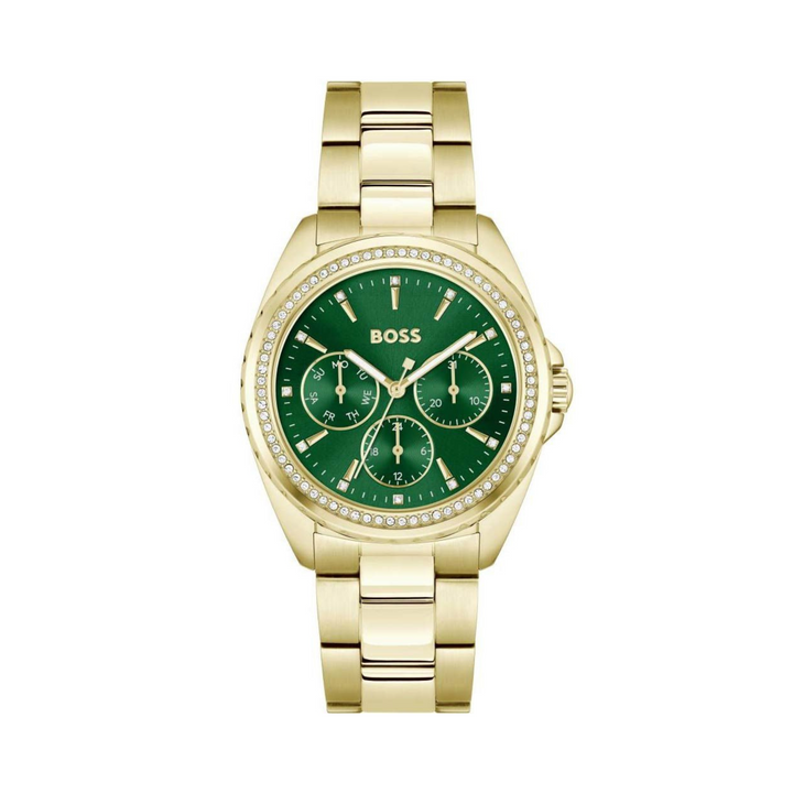 Indulge in timeless elegance with the Hugo Boss Atea Ladies Watch. Its vibrant emerald-green dial is beautifully framed by sparkling crystals and encased in warm gold-toned stainless steel, creating a striking balance between luxury and modern style.