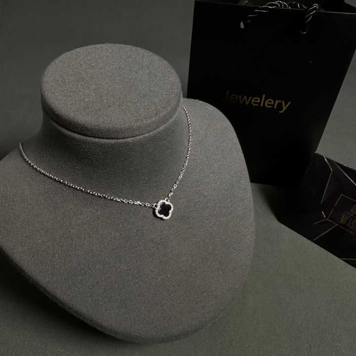 Bold yet refined, the Midnight Bloom Necklace blends the purity of 925 Italian silver with the striking charm of a black clover pendant. Weighing 5 grams, this elegant piece is designed for women who appreciate jewelry that stands out with subtle sophistication.