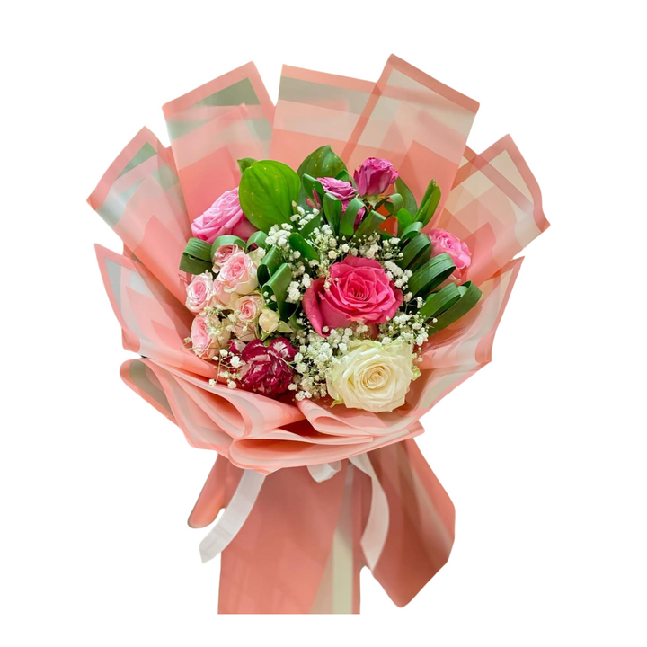 This delightful bouquet features seven elegant branches of mixed roses and delicate baby roses, bringing a vibrant mix of colors and textures to any occasion.