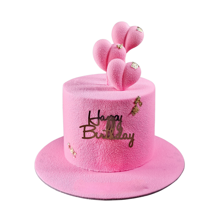This vibrant pink velvet-finish cake features three raised heart toppers and touches of edible gold for a luxurious flair. Ideal for birthdays, romantic surprises, or stylish celebrations. Freshly made and delivered with care to any address in Erbil by SHA100 Gifts.