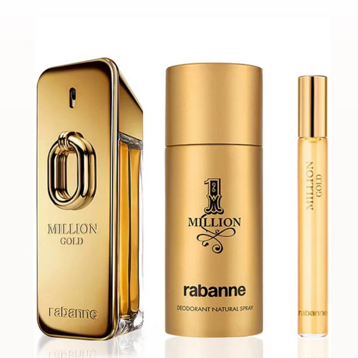 Indulge in pure confidence and prestige with the Rabanne 1 Million Gold Intense Men’s 3-Piece Gift Set, designed for bold and charismatic men. This luxurious set includes: