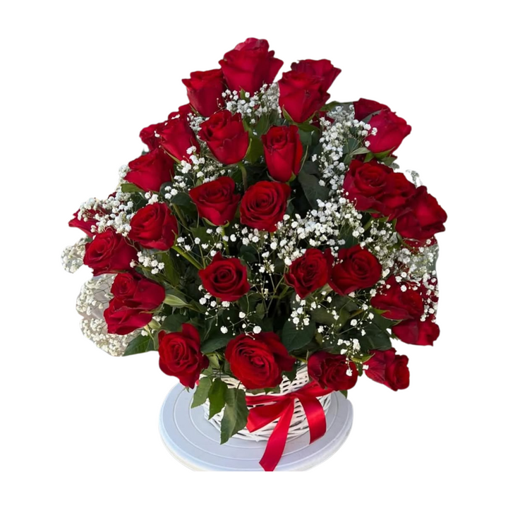 A classic expression of love and admiration, this basket of fresh red roses is the perfect choice to make any moment unforgettable. Bursting with passion and timeless elegance, the rich red roses are carefully arranged in a charming basket to create a breathtaking presentation.