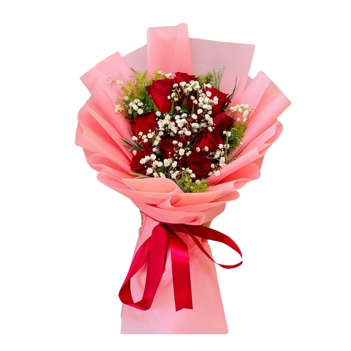 A charming bouquet of fresh red roses, elegantly wrapped in a soft pink wrap and tied with a bright red ribbon. This bouquet is perfect for expressing love and passion, making it a thoughtful choice for anniversaries, birthdays, or simply to brighten someone’s day.