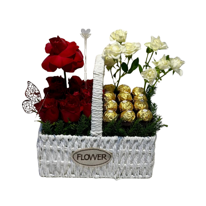 Celebrate special moments with this stunning basket filled with a perfect blend of fresh red and white roses, symbolizing love and purity. Accompanied by a box of luxurious Ferrero Rocher chocolates, this gift brings a touch of sweetness and elegance together.