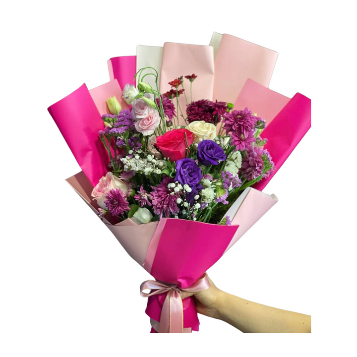 A regal mix of purple, red, pink, and white roses, wrapped in soft pink elegance. This bouquet is a celebration of romance and charm — a lush, colorful tribute that speaks volumes without saying a word.