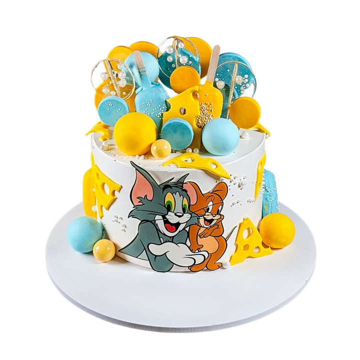 Bring childhood memories to life with this Tom & Jerry themed cake, perfect for kids and fans of the iconic duo. Designed to serve 8–10 people, this cake is decorated with playful details inspired by the beloved cartoon, adding a fun and joyful touch to any birthday or special occasion.
