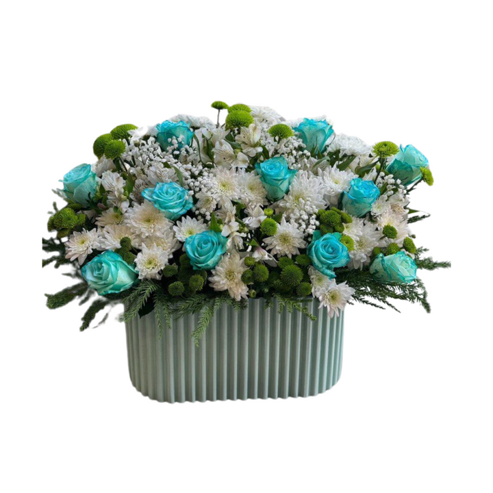 Surprise someone special in Sulaymaniyah with this unique and elegant box arrangement featuring vibrant turquoise roses paired gracefully with delicate white cherry roses.