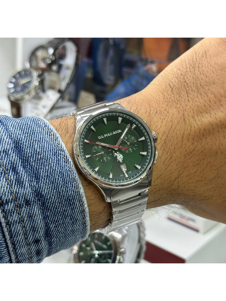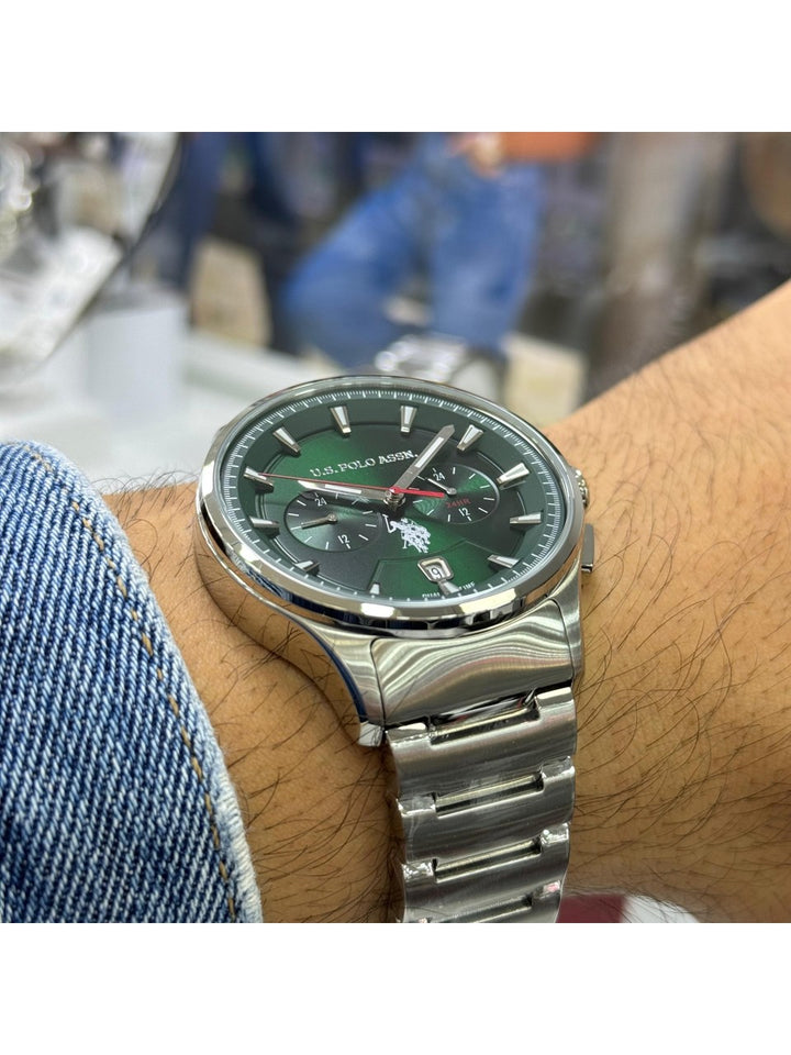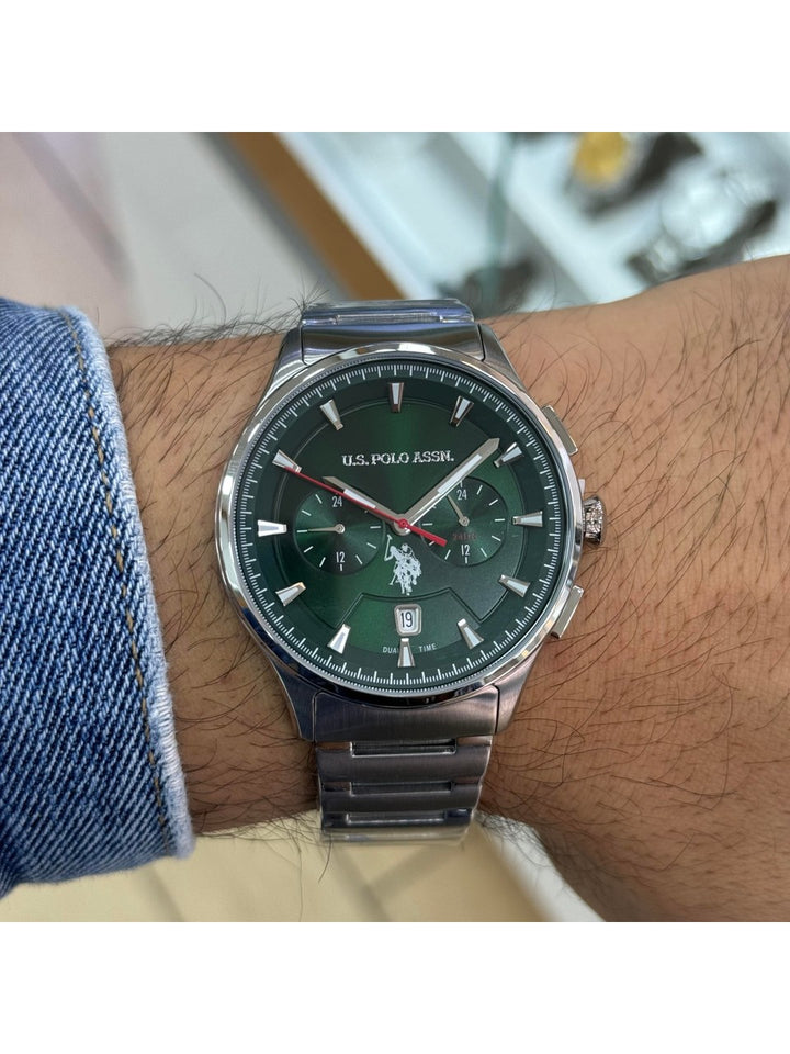 A refined accessory designed to elevate your style — the U.S. Polo Assn. USPA1080-01 features a sleek silver stainless steel case and bracelet, complemented by a striking green dial. With a 44mm round case and mineral glass, this timepiece offers both durability and elegance. The 5 ATM water resistance ensures practicality for everyday wear.