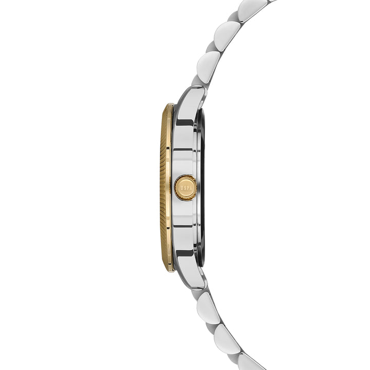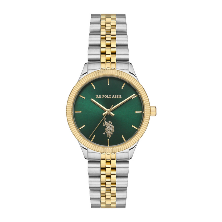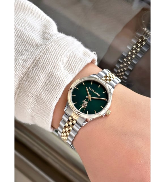 A refined accessory designed to elevate your style — the U.S. Polo Assn. USPA2061-07 features a sleek two-tone stainless steel case and bracelet, complemented by a striking green dial. With a 32mm round case and mineral glass, this timepiece offers both durability and elegance. The 5 ATM water resistance ensures practicality for everyday wear.