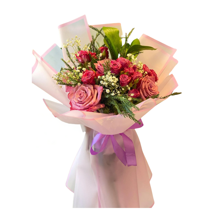 Soft and sweet, this bouquet brings together eight beautiful branches of pink roses and baby roses in a harmonious embrace.