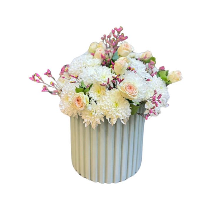 Surprise someone special in Sulaymaniyah with this stunning box arrangement featuring vibrant white roses paired gracefully with delicate white cherry roses.