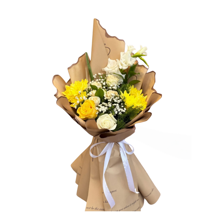 A tender bouquet of yellow and white roses, paired with pure white cherry roses, arranged in a gentle paige-colored wrap.